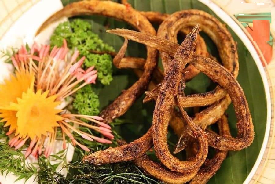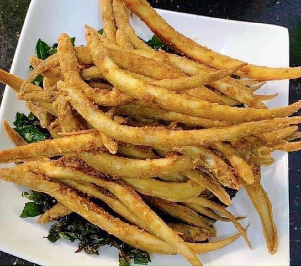 Cá sụn chiên giòn: Ướp cá với chút gia vị, bắt đầu cho lên chảo cho nóng rồi cho cá vào chiên vàng đều là được. Món này ăn cùng với nước mắm me là đúng điệu. Thịt cá ngọt thơm, da cá giòn, ăn luôn được cả xương.